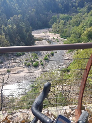 Après cette demi-heure en terrasse à l’ombre je remonte en selle assez confiant pour les 50 derniers Km. Après un court jardinage à la sortie de Lamastre la trace emprunte la Dolce via. Les 1% de pentes se roulent facilement. La fraîcheur des tunnels rafraîchit pour faire une lapalissade. J’ai de plus en plus chaud. Je commence vraiment à avoir du mal à absorber cette eau chaude. Je m’arrête un peu avant Le Cheylar dans une guinguette prendre une boisson avec glaçons. Bien qu’à l’ombre je n’arrive pas à redescendre en température. Même en roulant pas un poil d’air. Je parviens sur la partie de la Dolce via avec vue plongeante sur la vallée de l’Eyrieux. Ce régal