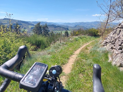 Je dépose mon sac de voyage dans la camionnette qui en assurera le transport jusqu’à l’hébergement d’arrivée à 1100 mètres d’altitude. D’un coup de ciseau je colle la puce de la plaque arrière sur la plaque de cintre. Je range le gamex dans une sacoche sachant que dès le 7ème km je monterai en température. Je me place en toute fin de groupe composé d’une soixantaine de participants. Le speaker lance le décompte : « 5, 4, 3, 2, 1 il est 10H c’est parti pour 200Km en 2 jours. Bon courage et faites-vous plaisir ». Le véhicule de la police municipale s’élance pour ouvrir le chemin en ville jusqu’à la via Rhona. Les 7 premiers km longent le Rhône. La cadence commune dépasse les 30Km/H. Virage à droite puis à gauche et nous voilà dans le village de Mauves. A sa sortie clignotant à gauche. Ça y est me voilà dans le vif du sujet … les 14 km de montée. Le groupe s’étire progressivement. Je réveille le plateau de 30. Je monte au train. L’inclinaison des 3 premiers km alterne entre 3% et 6%. Les suivants atteignent les 7 à 12%. Chemins de vigne et quelques parties asphaltées se succèdent. Que de beaux paysages. Les jambes tournent bien. Une participante m’interpelle : « j’ai vu Ardennes sur votre maillot. Vous venez de loin ! ». Malgré la pente nous échangeons une vingtaine de minutes sur ce qui nous a amené au gravel et la polyvalence de cette pratique. De rares portions relativement plates permettent de récupérer. Le soleil commence à se faire sentir. J’ai chaud la couenne. Le vent bien que de face est appréciable pour son côté rafraichissement. Je pense à boire une gorgée de boisson isotonique régulièrement. Je suis étonné que le convoi ne se soit pas plus étiré. En effet, de nombreux graveleux roulent toujours devant moi. De ce fait je ne regarde guère mon GPS. Je suis bêtement la roue devant moi. Je m’attends donc à un moment donné à me retrouver hors trace car seuls les premiers participants naviguent réellement. La technique du mouton de Panurge a effectivement ses limites. Heureusement, mon Karoo se met à m’assassiner les tympans pour m’alerter de l’erreur de direction. J’hurle pour en informer les 2 graveleux 10 mètres devant moi. Ils me remercient et nous rebroussons chemin de 50 mètres pour reprendre la trace. Nous papotons par moment d’itinérance en bikepacking avant d’entamer la 1ère longue descente. Les 40Km/H rafraichissent agréablement. Les virages à forte courbe imposent de rester concentré. Ces km de route goudronnée débouchent sur un chemin toujours au profil descendant. L’Ardèche sort ses atouts. De la caillasse sur 800 mètres. Il est nécessaire de bien placer ses roues et de récupérer les glissades avant d’arriver à Saint-Romain de Lerps. Je laisse mes 2 compères filer pour immortaliser mon passage au col de Mayres. Je ressens de plus en plus la chaleur d’autant plus que ça fait bien longtemps que je n’ai pas roulé sous 26°. Le ravito de Colombier le Jeune au km 45 est le bienvenu. Je déglutis coca et eau pétillante. Je mache banane, orange, un mini saucisson et autres aliments. Si au niveau boisson le ravito est copieux il manque du salé type petits « toasts », fromages. Je discute avec un possesseur d’un Ridley. Je rempote mon bidon. Je reprends mon périple après cette pause d’une quinzaine de minutes.